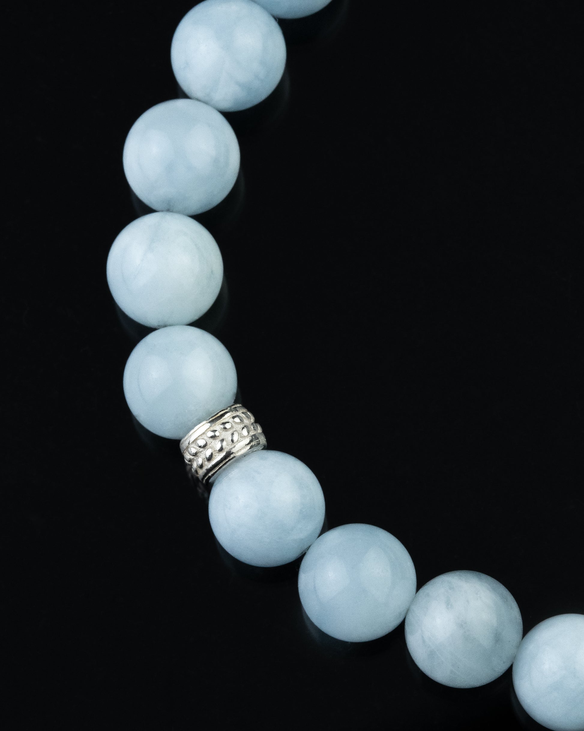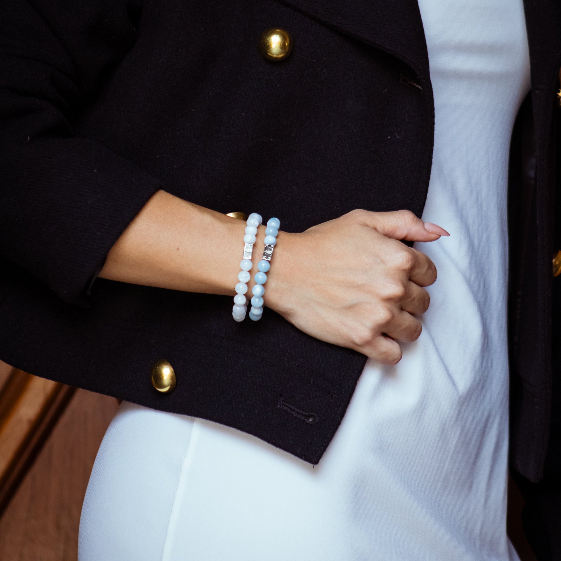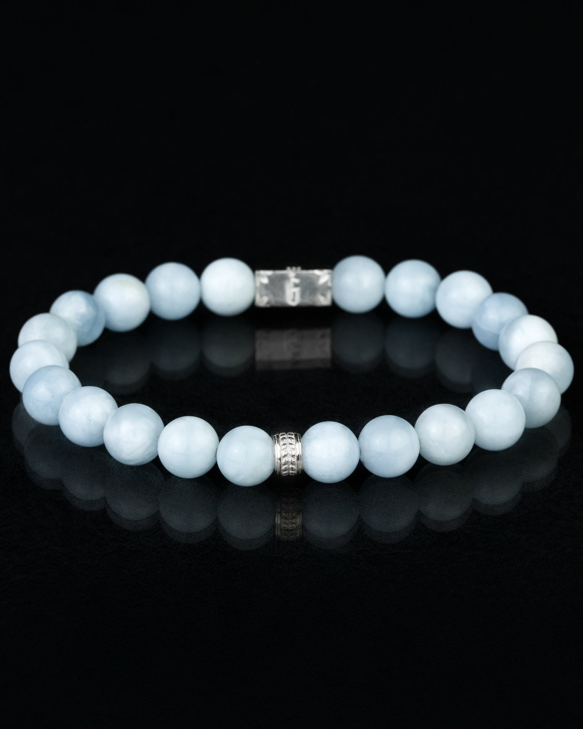 Pulsera elaborada con piedra natural de lapislázuli en esferas de 8 mm, realzada con detalles de plata esterlina 925. Su diseño incorpora un elástico reforzado que brinda ajuste cómodo y resistente para uso diario.