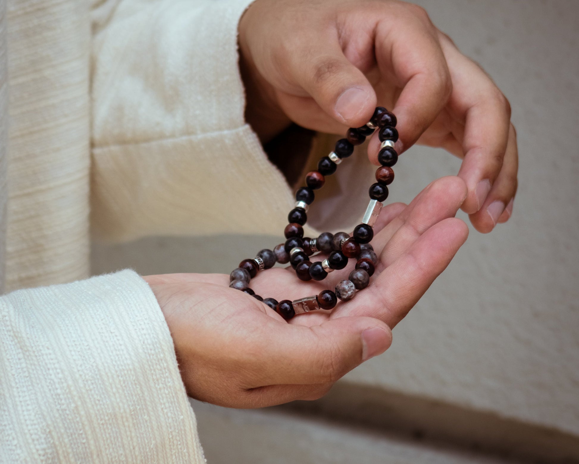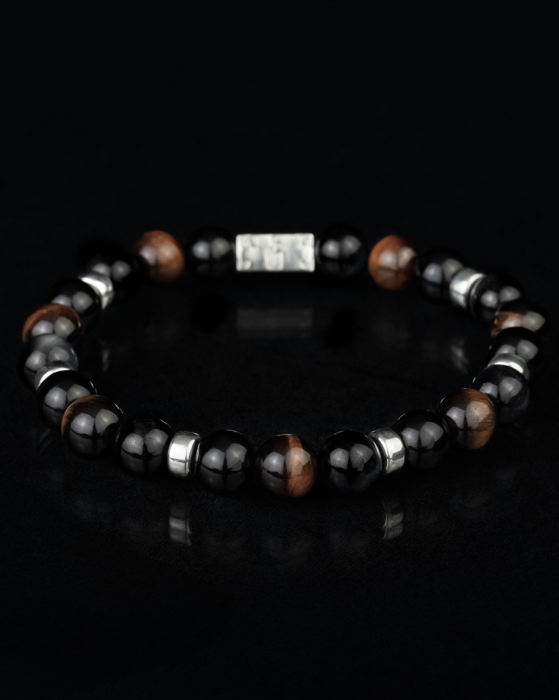 Pulsera elaborada con piedra natural de Ojo de buey y Obsidiana en esferas de 8 mm, realzada con detalles de plata esterlina 925. Su diseño incorpora un elástico reforzado que brinda ajuste cómodo y resistente para uso diario.