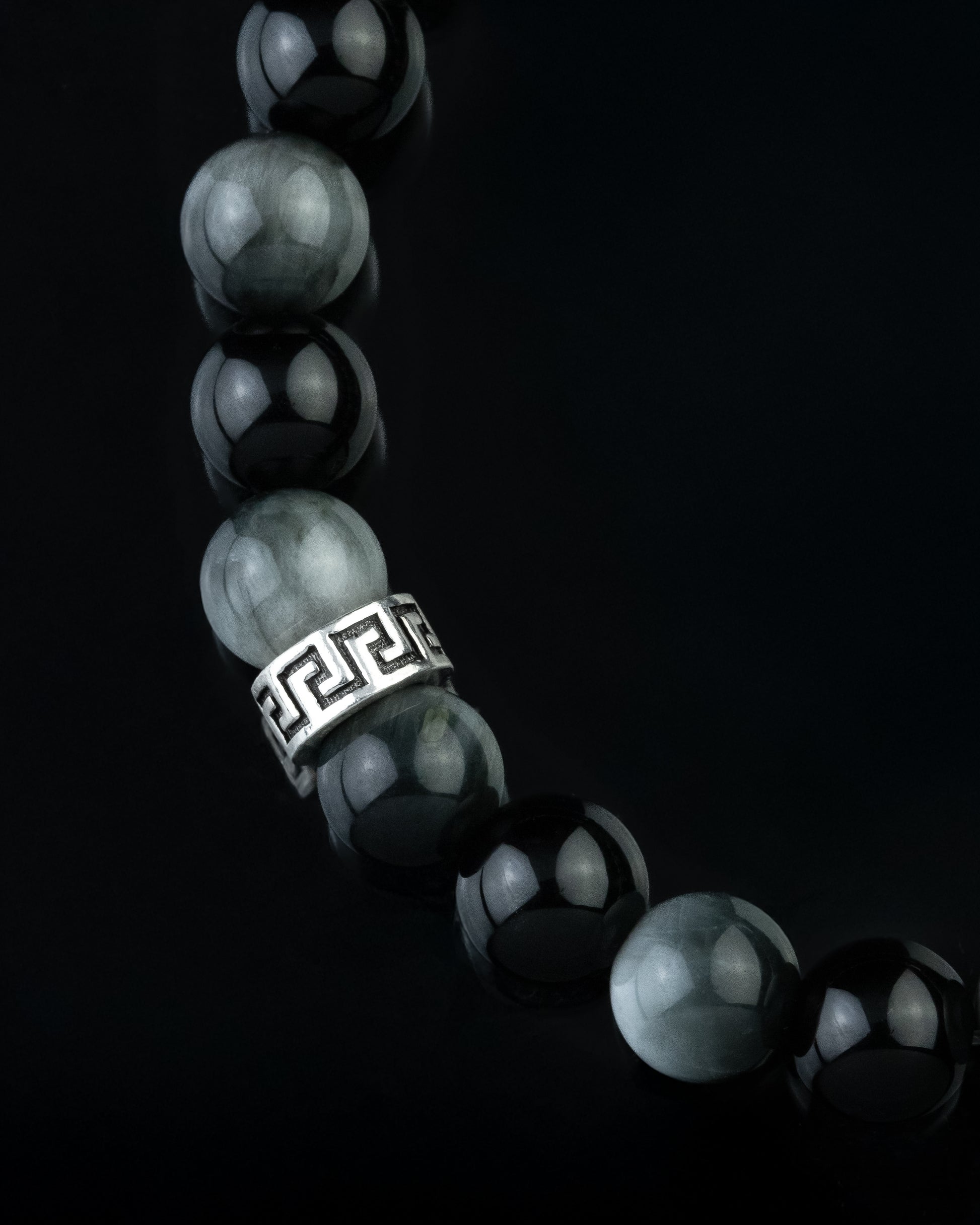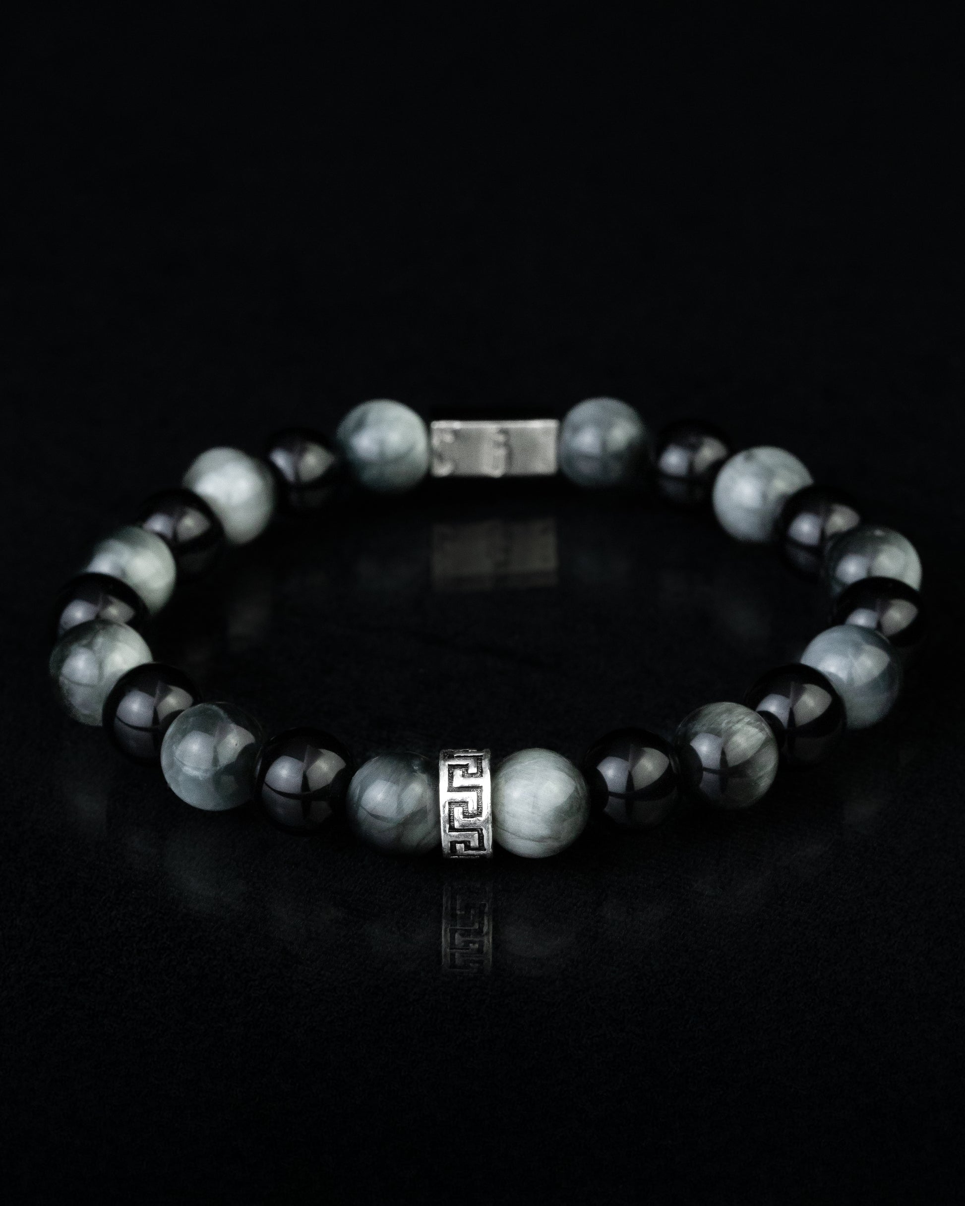 Pulsera elaborada con piedra natural de lapislázuli en esferas de 8 mm, realzada con detalles de plata esterlina 925. Su diseño incorpora un elástico reforzado que brinda ajuste cómodo y resistente para uso diario.