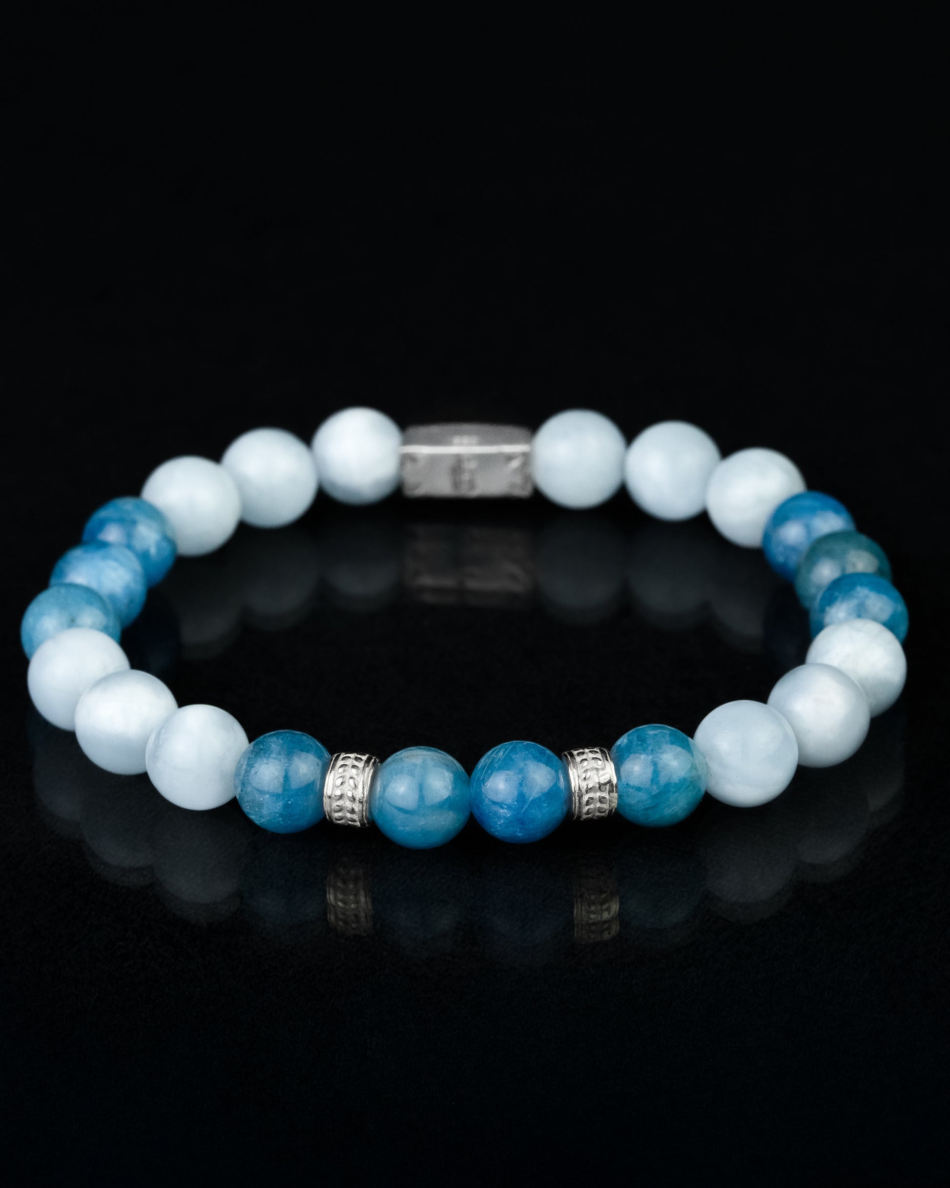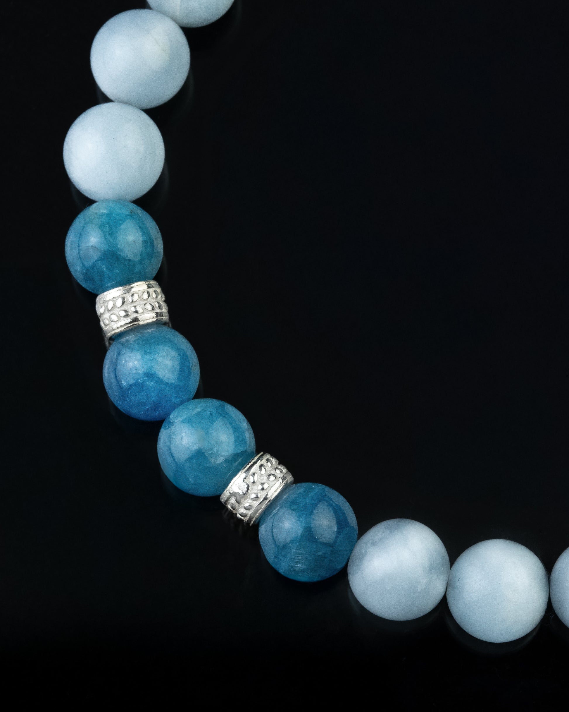 Pulsera elaborada con piedra natural de lapislázuli en esferas de 8 mm, realzada con detalles de plata esterlina 925. Su diseño incorpora un elástico reforzado que brinda ajuste cómodo y resistente para uso diario.