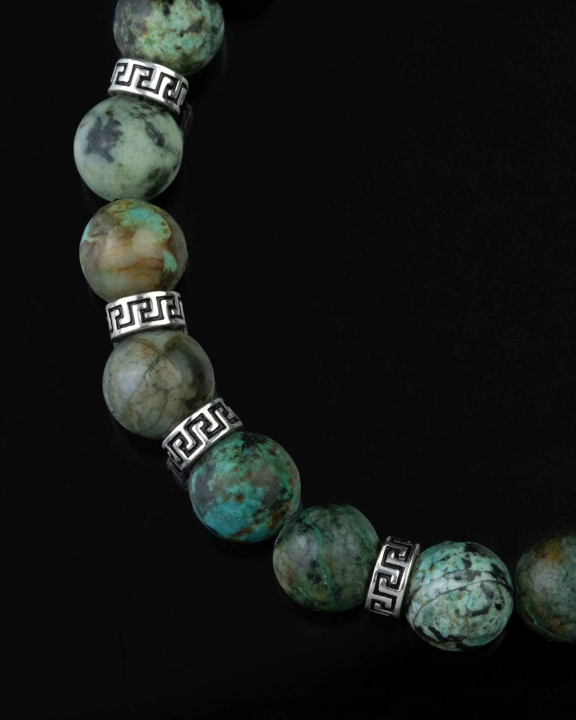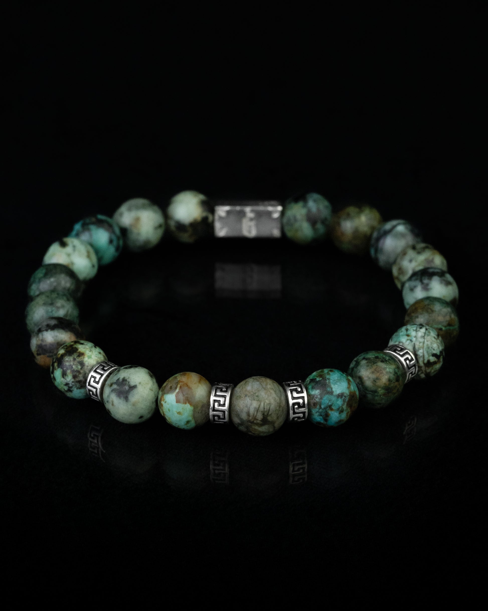 Pulsera elaborada con piedra natural de Turquesa Africana en esferas de 8 mm, realzada con detalles de plata esterlina 925. Su diseño incorpora un elástico reforzado que brinda ajuste cómodo y resistente para uso diario.