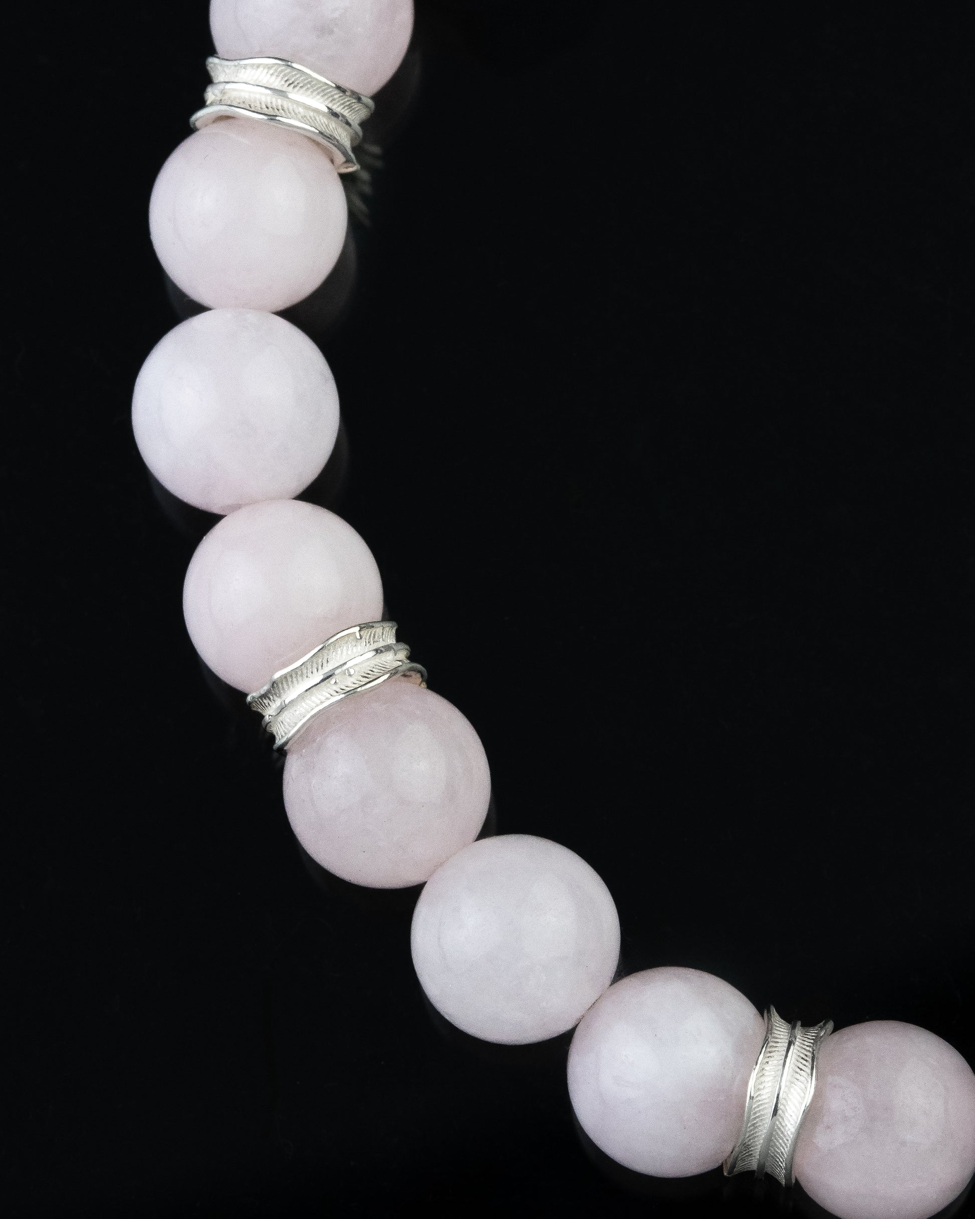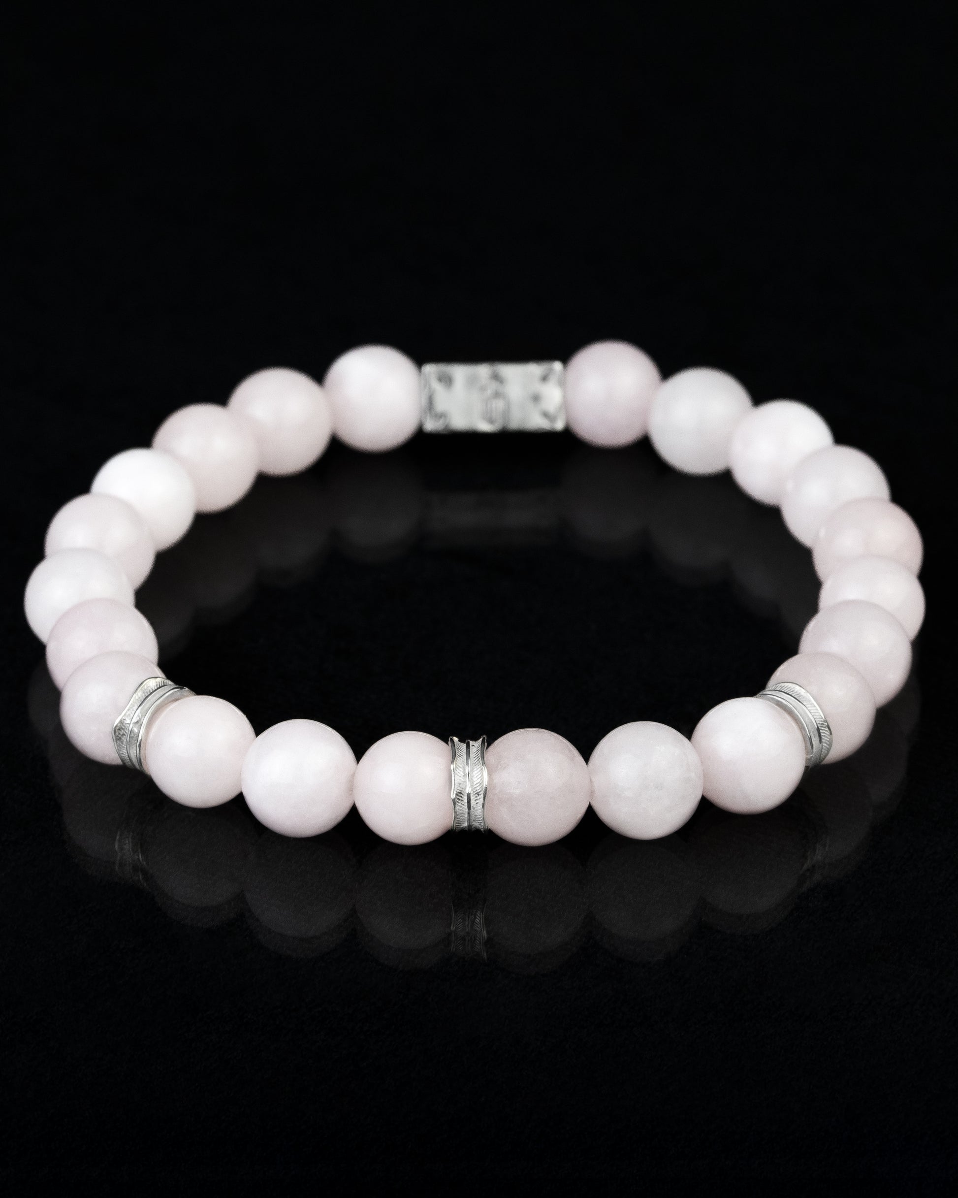 Pulsera elaborada con piedra natural de morganita en esferas de 8 mm, realzada con detalles de plata esterlina 925. Su diseño incorpora un elástico reforzado que brinda ajuste cómodo y resistente para uso diario. Las piedras han sido seleccionadas cuidadosamente para asegurar una apariencia uniforme y elegante.