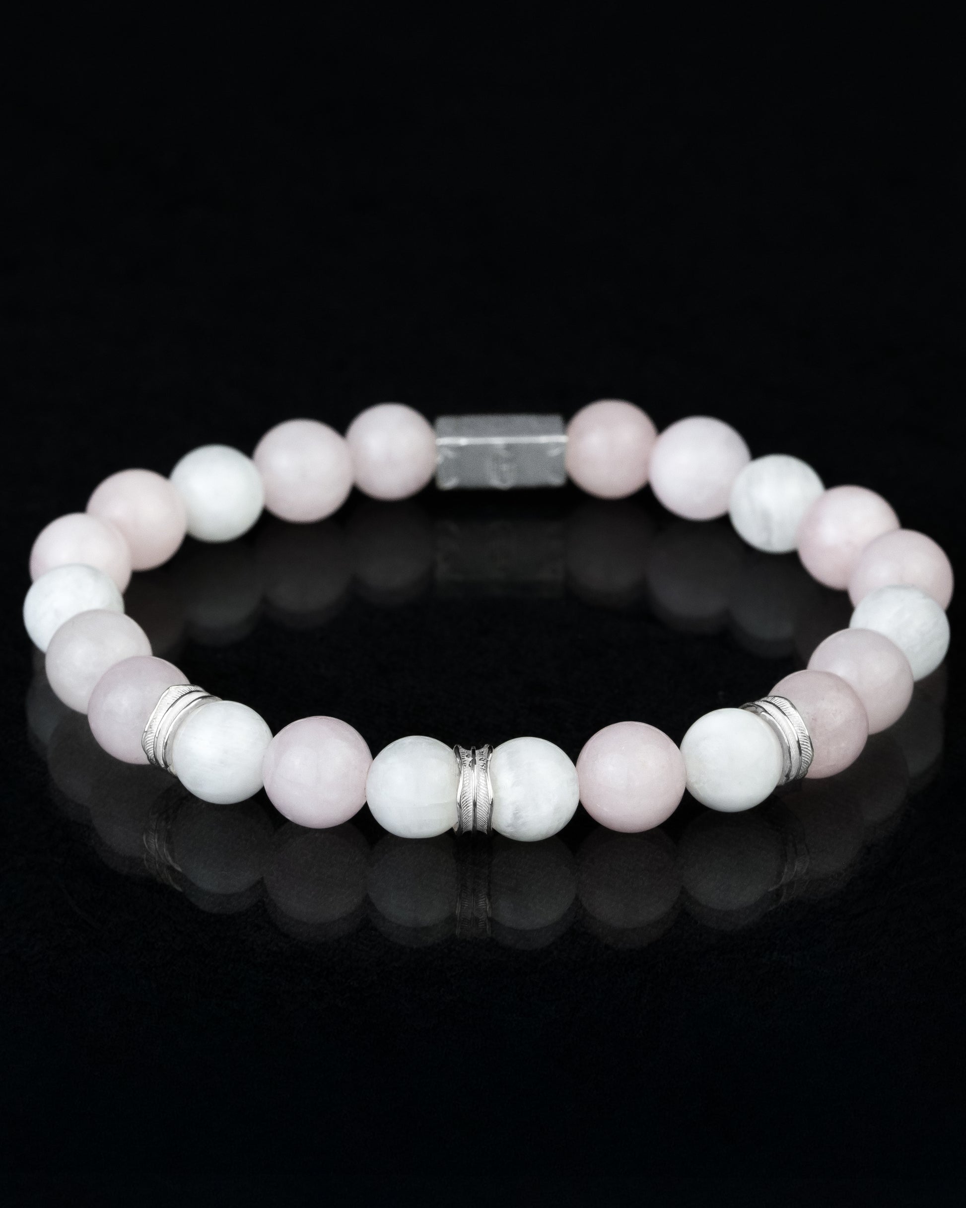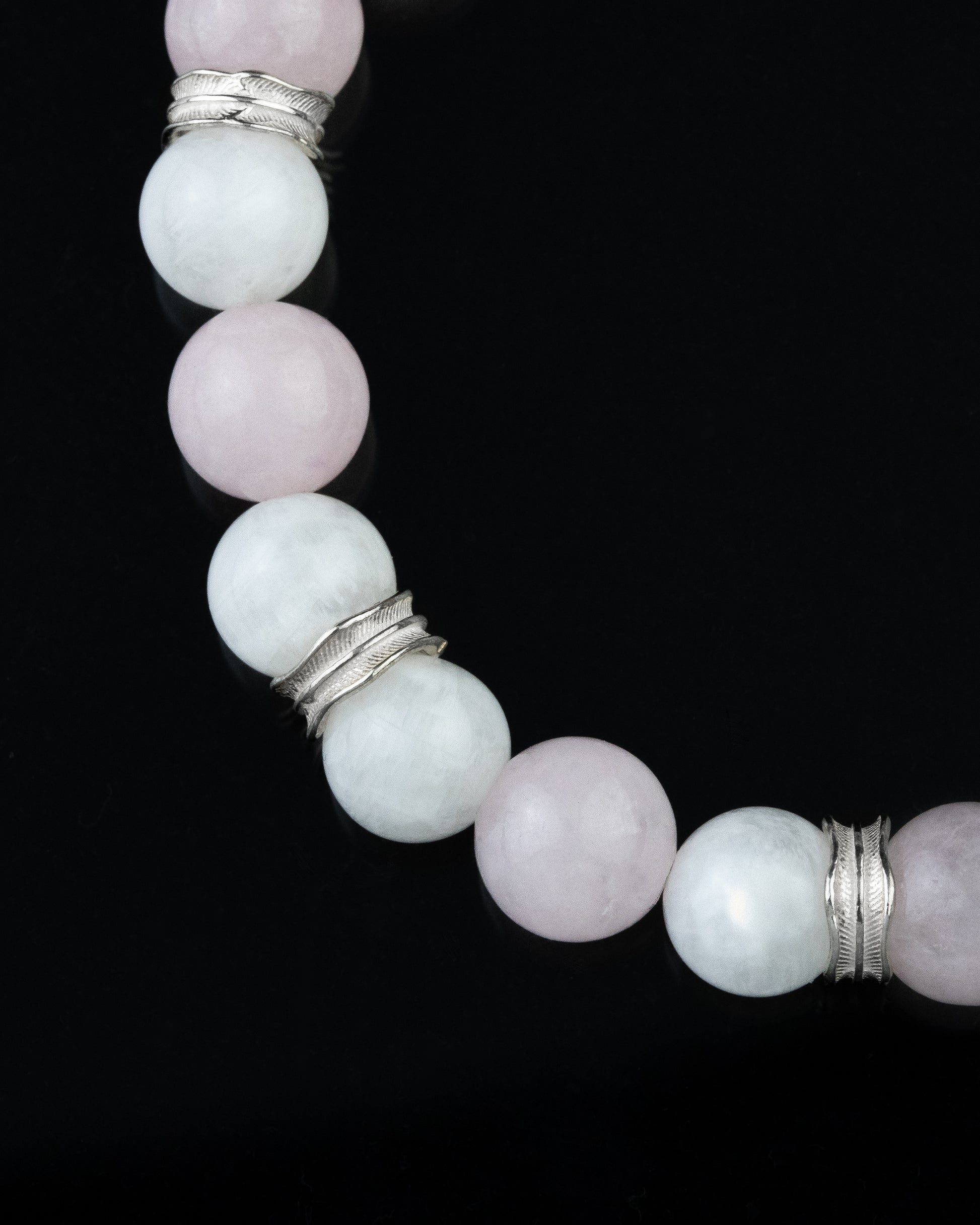 Pulsera elaborada con piedra natural de Morganita y Piedra Luna en esferas de 8 mm, realzada con detalles de plata esterlina 925. Su diseño incorpora un elástico reforzado que brinda ajuste cómodo y resistente para uso diario.