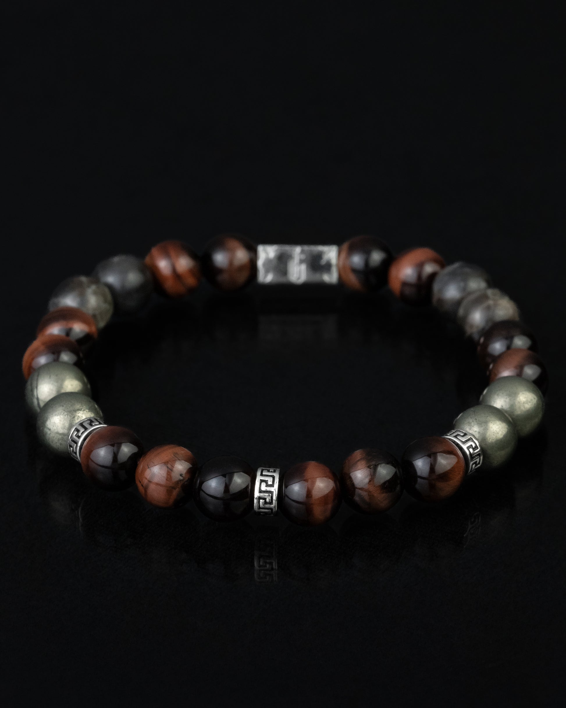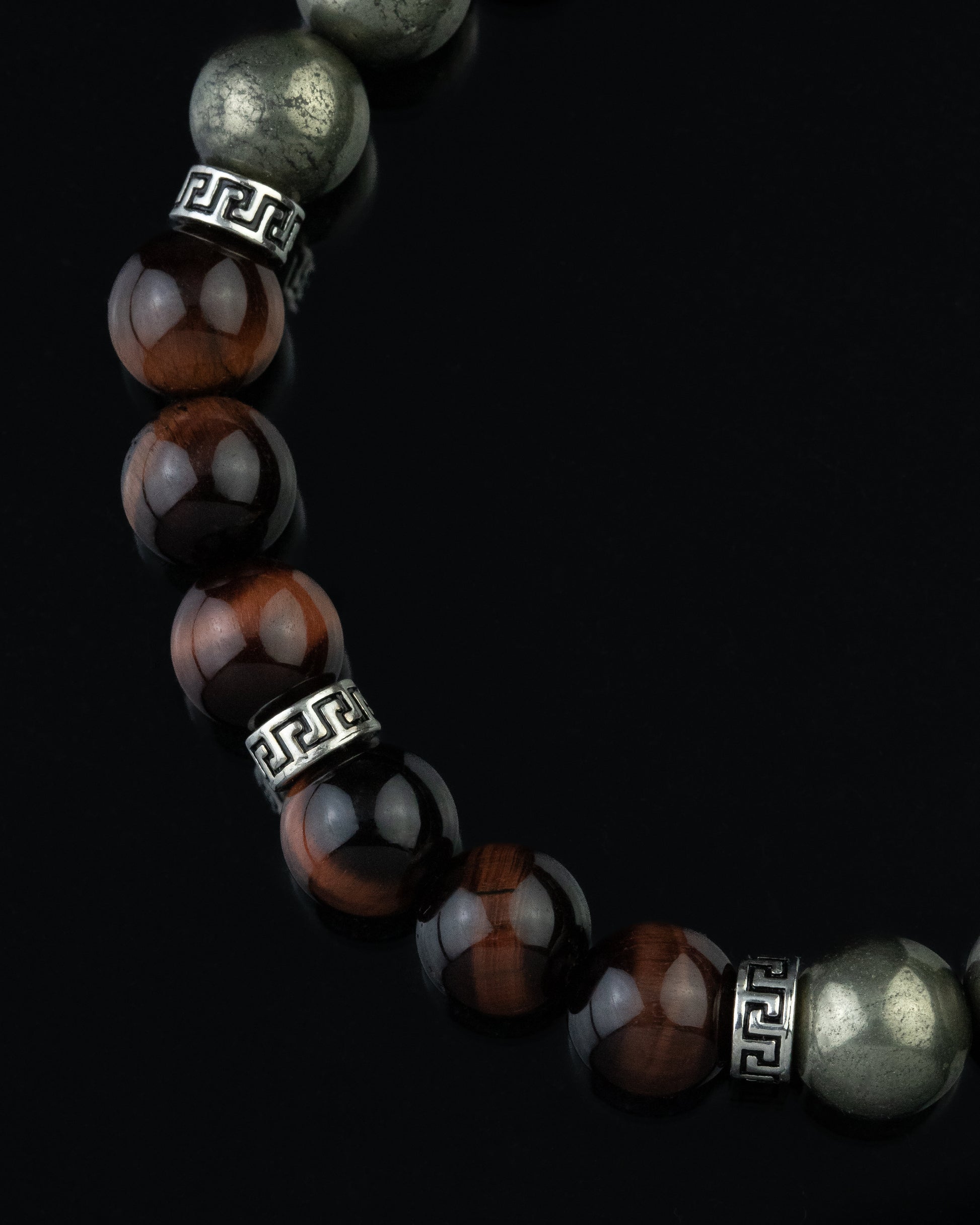 Pulsera elaborada con piedra natural de Ojo de buey, Pirita, Espectrolita Café en esferas de 8 mm, realzada con detalles de plata esterlina 925. Su diseño incorpora un elástico reforzado que brinda ajuste cómodo y resistente para uso diario.