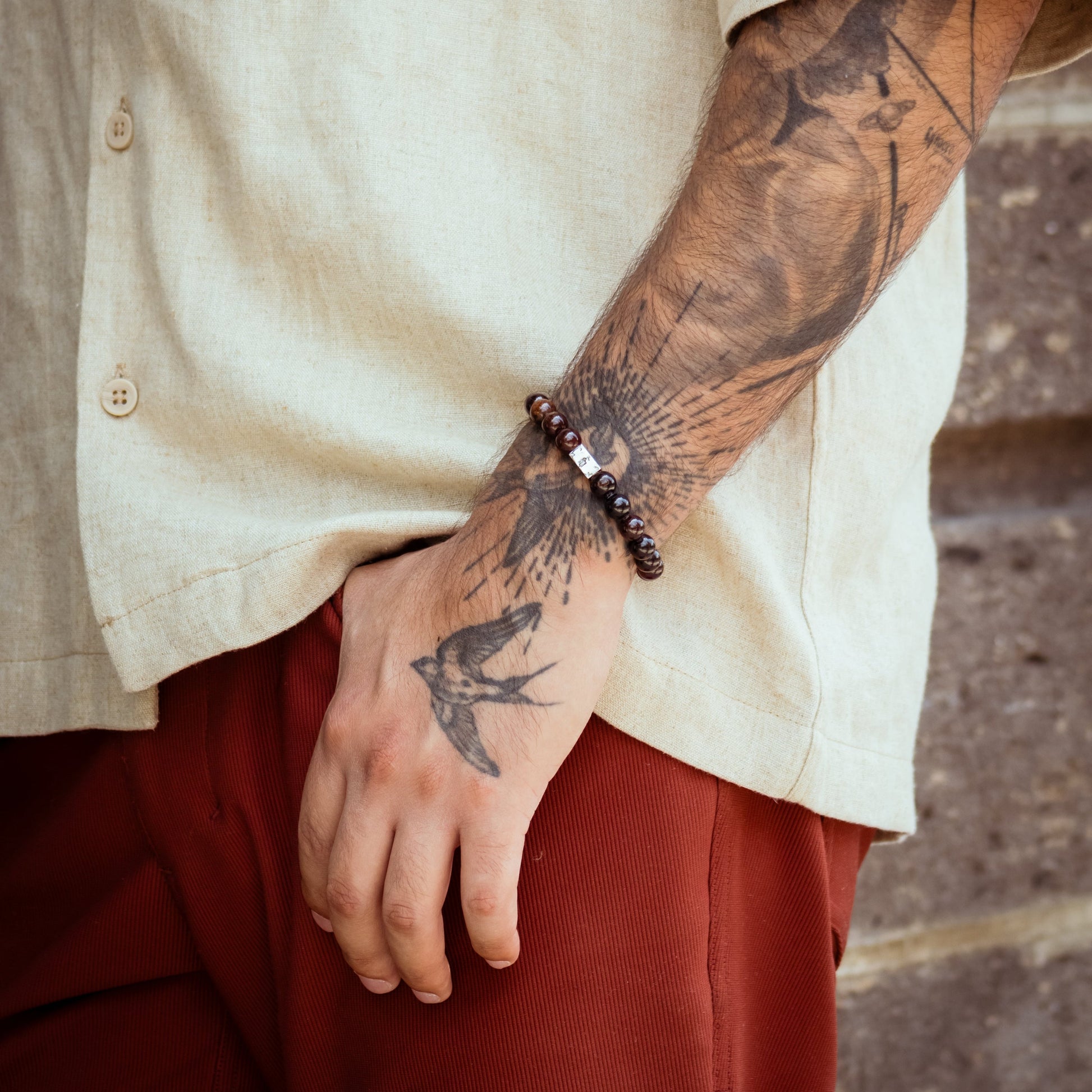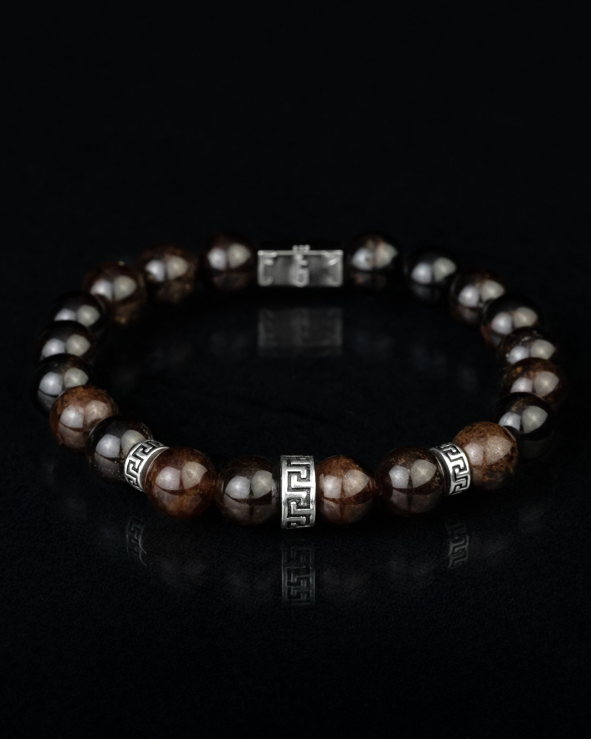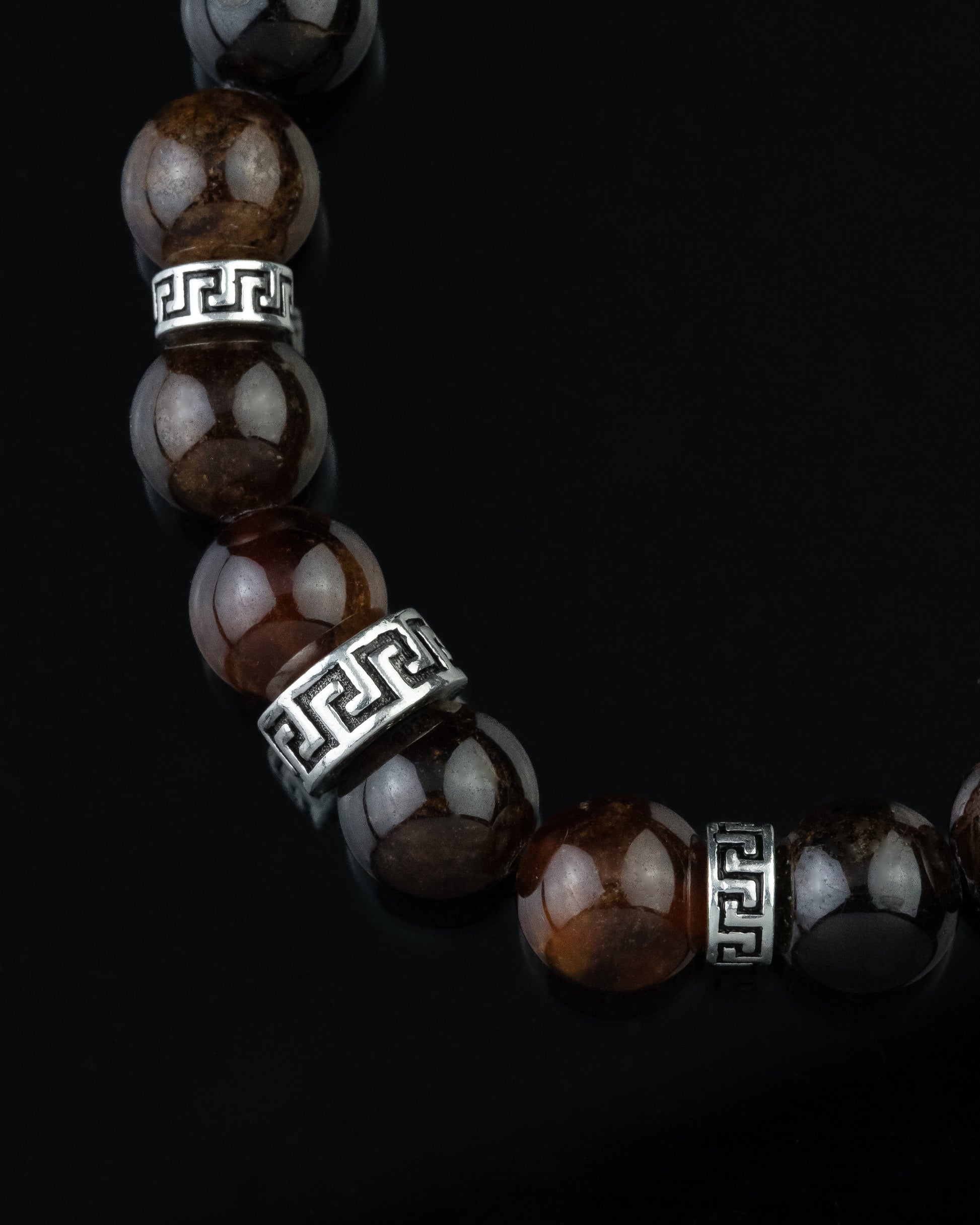 Pulsera elaborada con piedra natural de Granate Espersatita en esferas de 8 mm, realzada con detalles de plata esterlina 925. Su diseño incorpora un elástico reforzado que brinda ajuste cómodo y resistente para uso diario.
