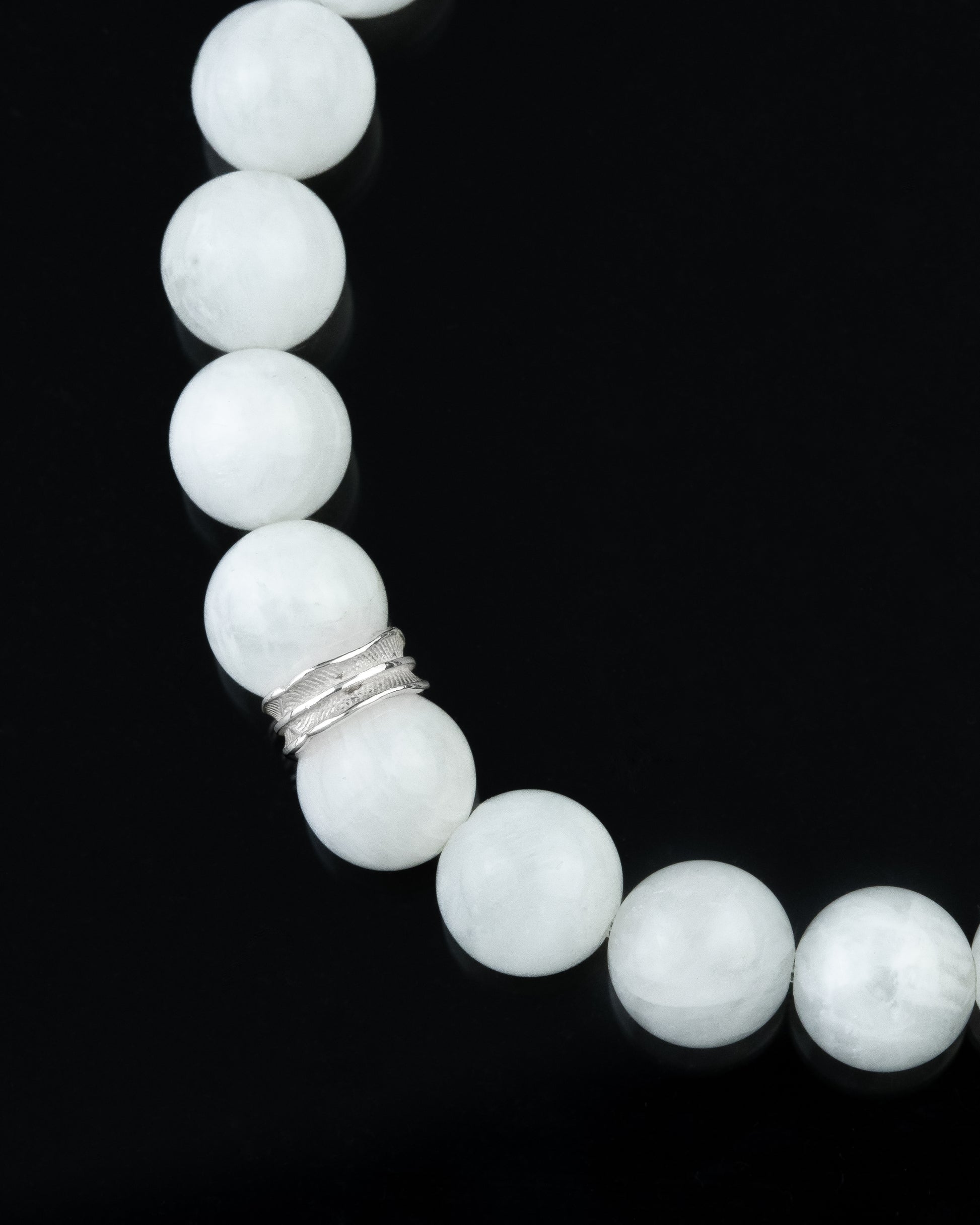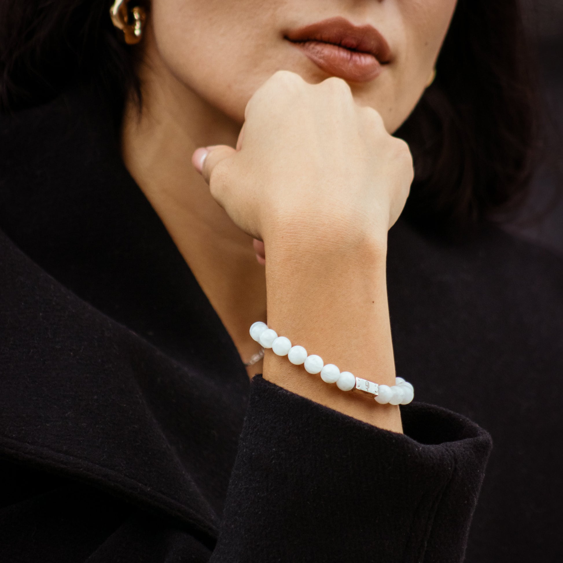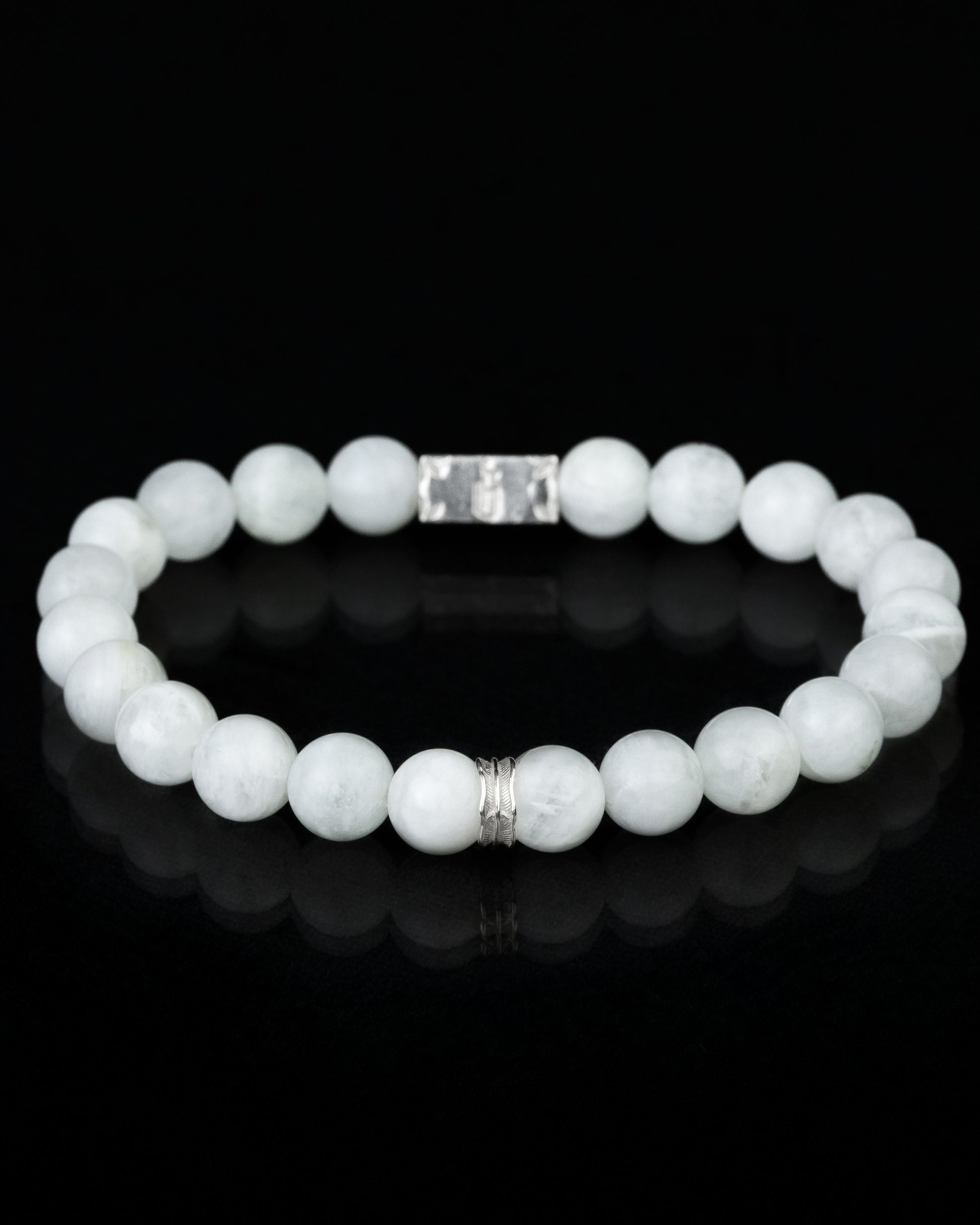 Pulsera elaborada con piedra natural de Piedra Luna en esferas de 8 mm, realzada con detalles de plata esterlina 925. Su diseño incorpora un elástico reforzado que brinda ajuste cómodo y resistente para uso diario.
