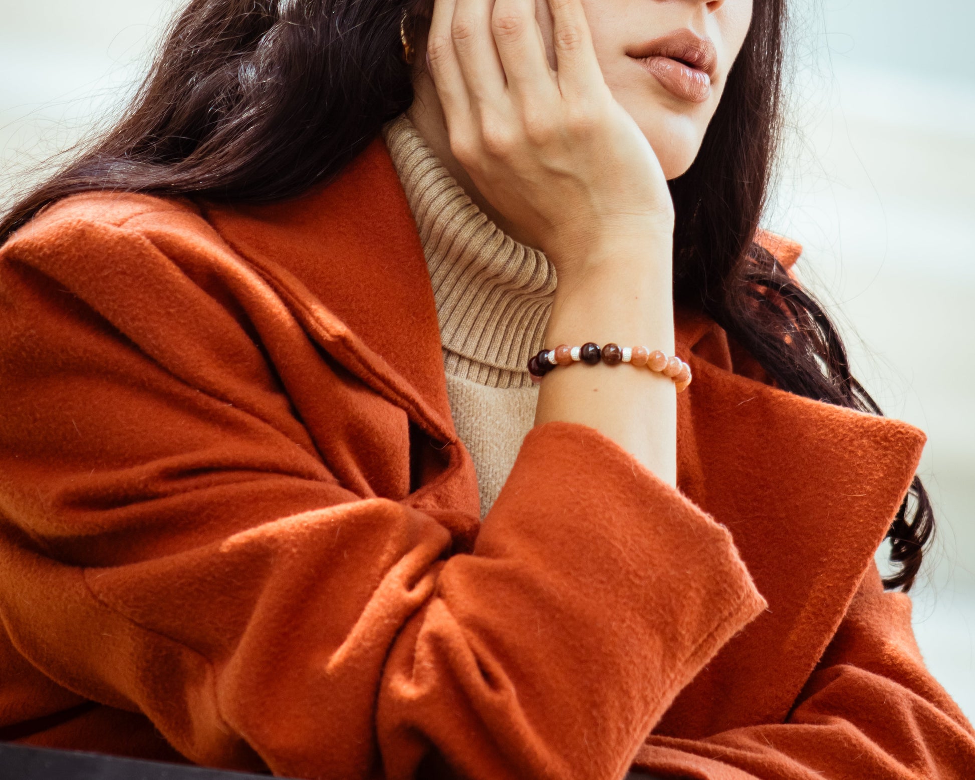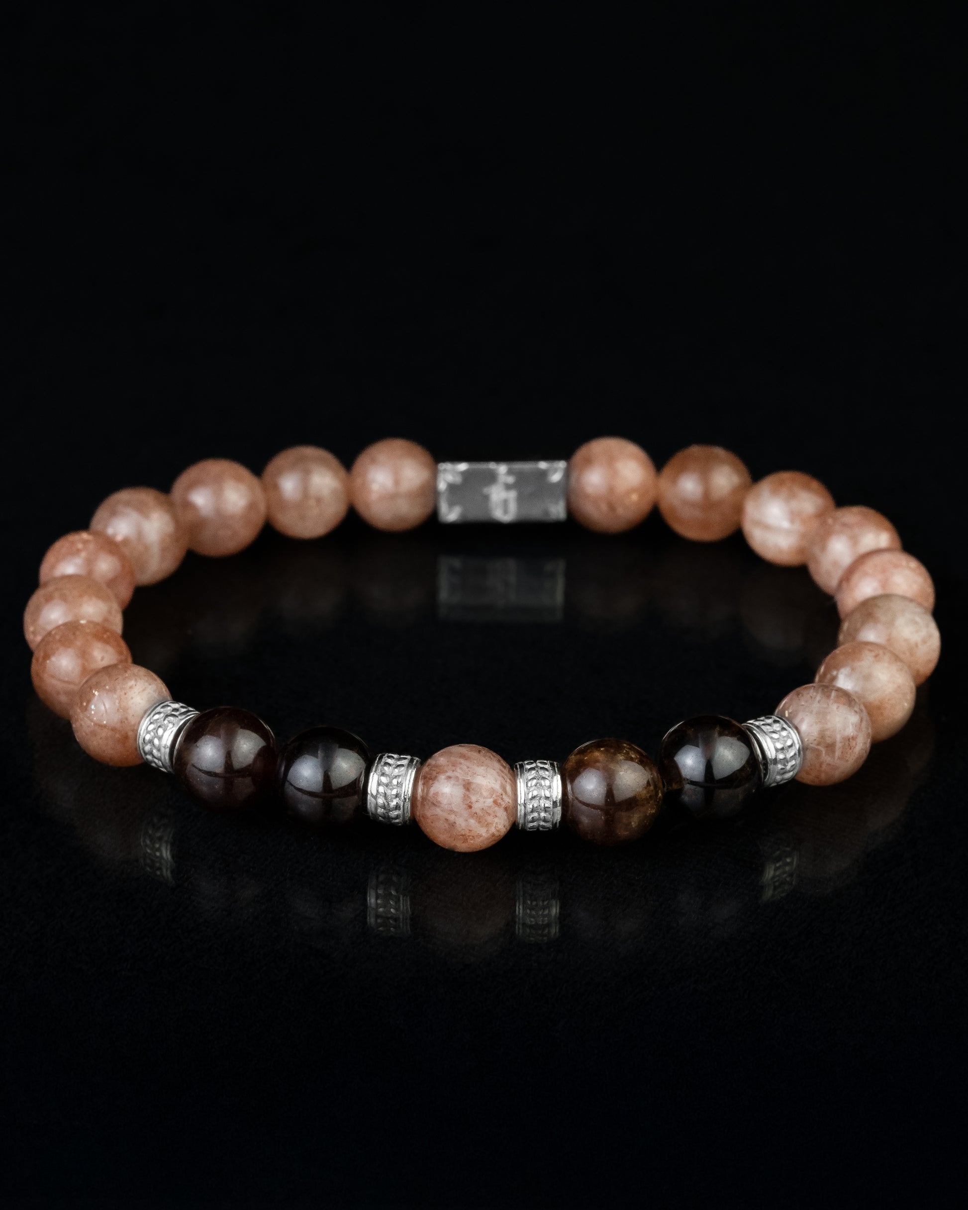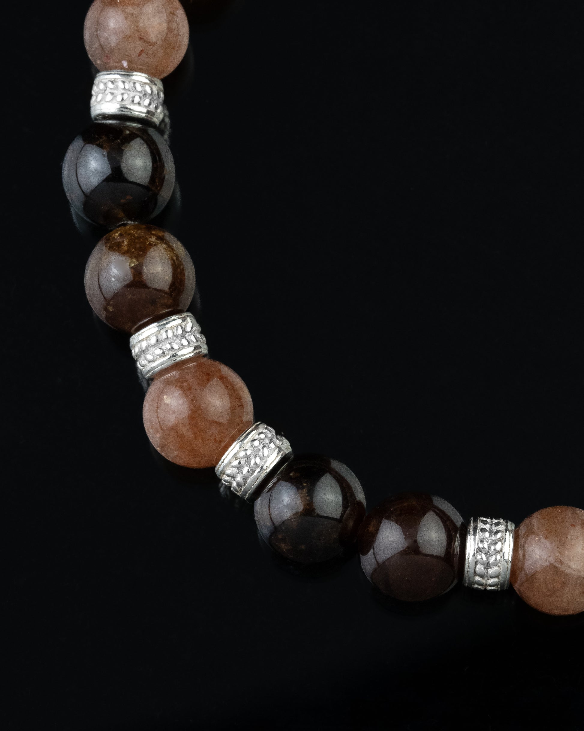 Pulsera elaborada con piedra natural de Granate Espersatita y Piedra Solar Dorada en esferas de 8 mm, realzada con detalles de plata esterlina 925. Su diseño incorpora un elástico reforzado que brinda ajuste cómodo y resistente para uso diario.