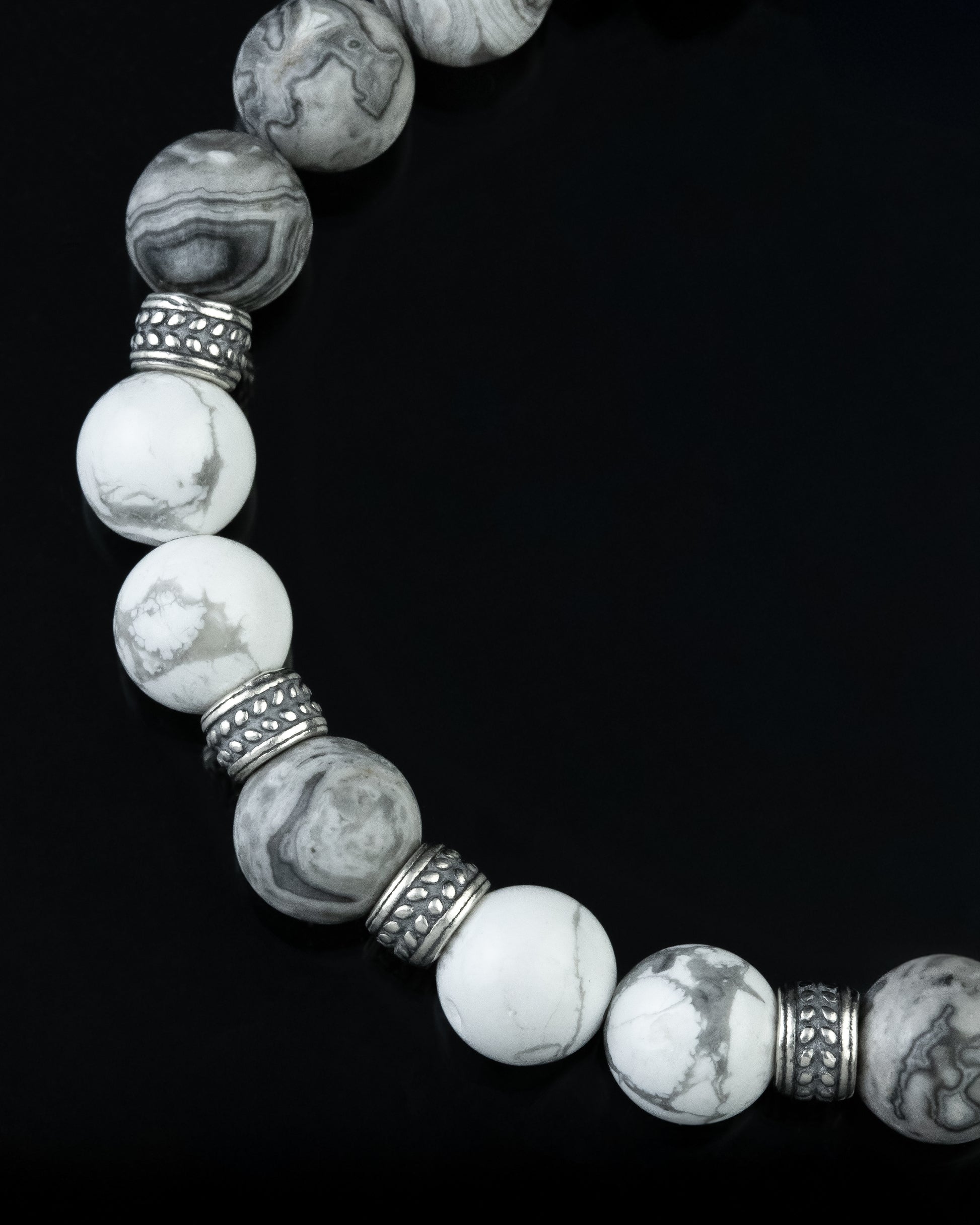 Pulsera elaborada con piedra natural de Jaspe Gris y Howlita en esferas de 8 mm, realzada con detalles de plata esterlina 925. Su diseño incorpora un elástico reforzado que brinda ajuste cómodo y resistente para uso diario.